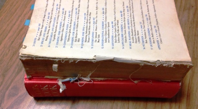 That cookbook had a bright yellow cover – to start with. I don’t remember losing the first piece of the cover, but I know the front cover and spine went first, which was kind of convenient, because I was left with a big book that essentially had a cardboard stand on the back. Eventually, the back cover went with the first, and then the table of contents and index pages gradually started to peel away, never having been meant to be out in the open.