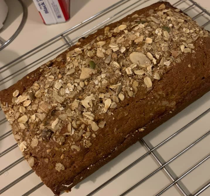 Bake at 350F for 60 min or until it tests clean. Cool for about an hour in the pan, then move to a wire rack to cool completely. Ours lost a few slices on the way to the cooling rack, because that’s the best part of homemade bread.