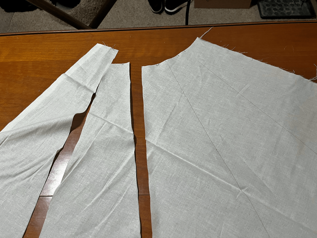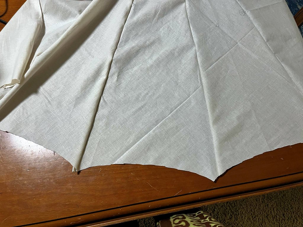 The shoulder to knee length became the radius of a quarter circle, and the shoulder from collar to armscye became the circumference of the quarter circle removed from the point. I then calculated how many panels I thought would look good (five), added seam allowance, and quickly drafted a muslin.